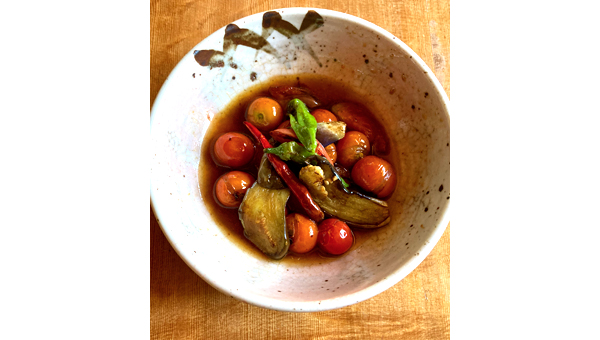 アトリエ菜園の夏の収穫を全部入れた、焼き浸し。野菜をお好みの油でよく焼いて熱いうちにめんつゆに浸すだけ!冷やしてそうめんと一緒にいただきます。